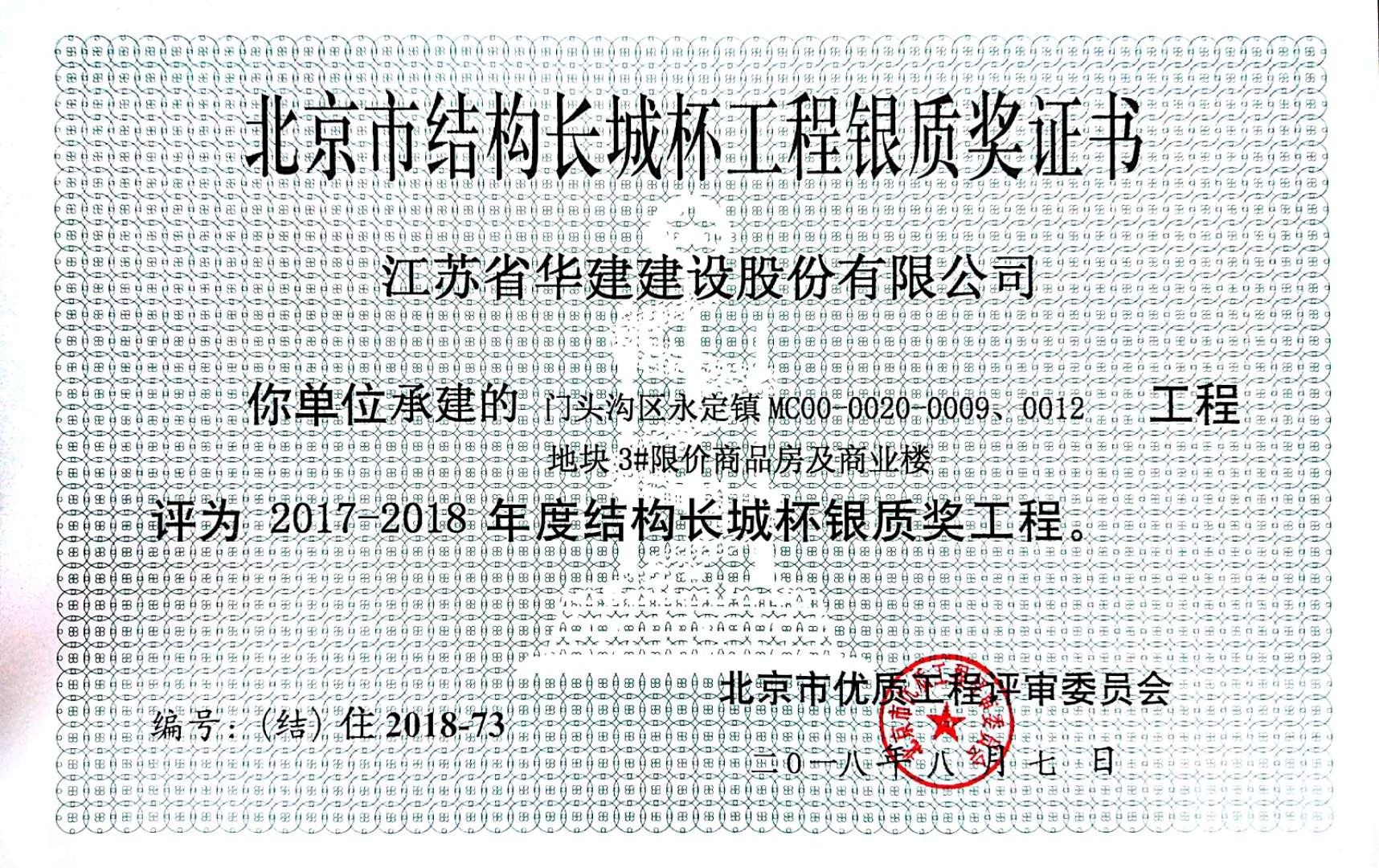 北京公司再獲兩項省級優質結構工程 時間:2018-10-20 3268 近日,北京市工程建設質量管理協會公布了2017-2018年度北京市結構長城杯工程及獲獎單位,由北京公司承建的門頭溝區永定鎮MC00-0020-0009、0012地塊3#限價商品房及商業樓項目獲得結構長城杯銀質獎。 同時,由我司承建的綠城楊柳郡一期17#樓、18#樓、裙房及地下室工程被評定為2018年廣西建設優質結構獎。