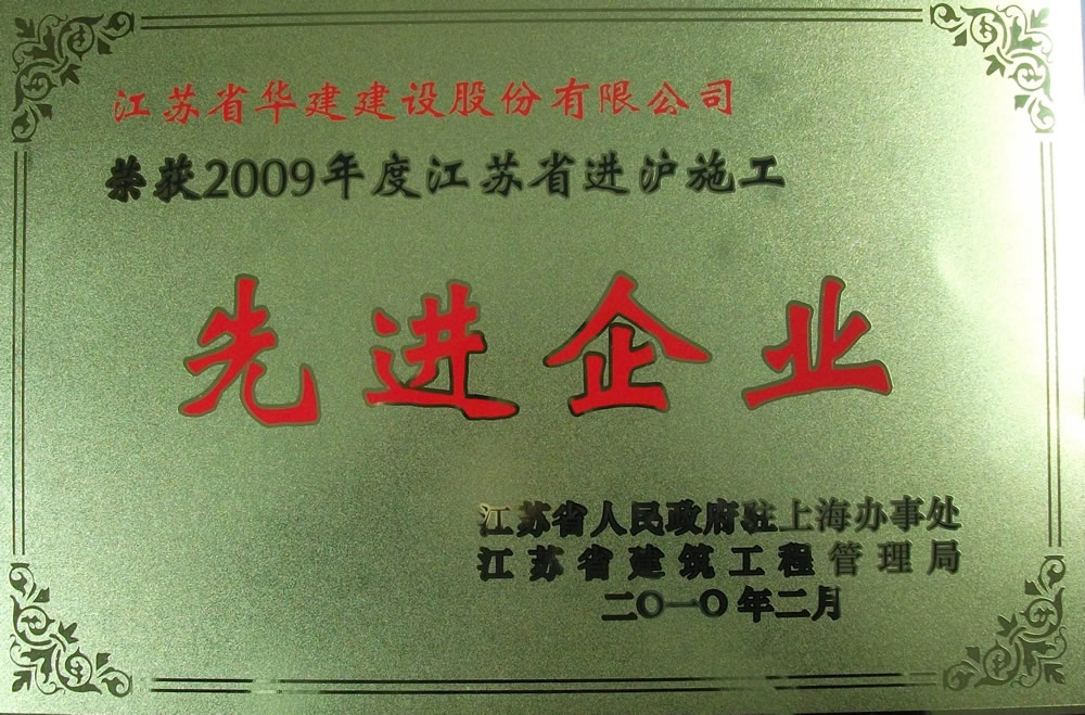 公司七獲“江蘇省進滬施工先進企業”稱號 時間:2010-03-29 6303 3月10日,在江蘇省政府駐滬辦、江蘇省建管局召開的2009年度江蘇進滬施工總結表彰暨迎世博動員大會上,江蘇華建被表彰為“江蘇省進滬施工先進企業”,這已是第七次獲次殊榮;表彰會上, 上海洛克外灘源總承包項目部、中船臨港二期加工綜合樓項目部被評為優秀項目部,另有3人被評為優秀項目經理,各有1人被評為安全管理先進個人、質量管理先進個人、經營管理先進個人、財務管理先進個人,有2人被評為綠色施工管理先進個人。