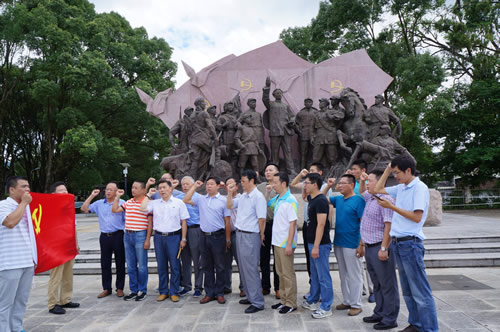 上海分公司黨總支組織開展“紅色之旅”教育 時間:2016-08-16 4054 8月12日,上海分公司黨總支組織部分黨員干部和入黨積極分子共18人,赴愛國主義教育基地福建古田開展“促兩學一做,走紅色之旅”教育活動,在“主席園”向毛主席像敬獻花籃,在“豐碑軍魂”雕像前面對黨旗重溫入黨誓詞,還仔細參觀古田會議地址和紀念館,回顧緬懷了老一輩無產階級革命家的不朽事跡。大家牢記“古田會議永放光芒”精神,紛紛表示:“不忘初心,繼續前行”。