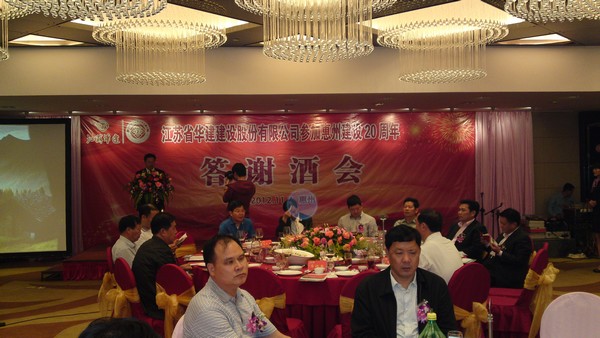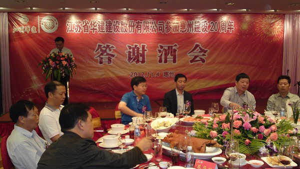 11月4日,公司在惠州凱賓斯基酒店王子飯店隆重召開參加惠州建設(shè)20周年慶典暨答謝酒會,公司副董事長、總經(jīng)理宗有農(nóng)主持酒會并作開場致辭。惠州市有關(guān)政府部門、部分合作方企業(yè)的負責人,華建聯(lián)盟成員單位負責人,公司董事、監(jiān)事和高管等130余人出席慶典。惠州公司總經(jīng)理華恒榮介紹了公司參加惠州建設(shè)20年的有關(guān)情況。惠州市工商聯(lián)主席、公司戰(zhàn)略合作伙伴恒宇實業(yè)集團公司董事長楊滿芳代表合作方發(fā)言,惠州市住房和城鄉(xiāng)規(guī)劃建設(shè)局副局長陳訓政代表政府主管部門致辭,分別對江蘇華建進駐惠州施工、參加惠州建設(shè)20周年表示祝賀。公司董事長陸金龍代表公司總部對惠州市有關(guān)政府部門、相關(guān)合作方和社會各界人士給予公司的關(guān)心和支持表示誠摯的感謝,并表達了進一步加大支持力度、加強戰(zhàn)略合作、加快科學發(fā)展的意愿。