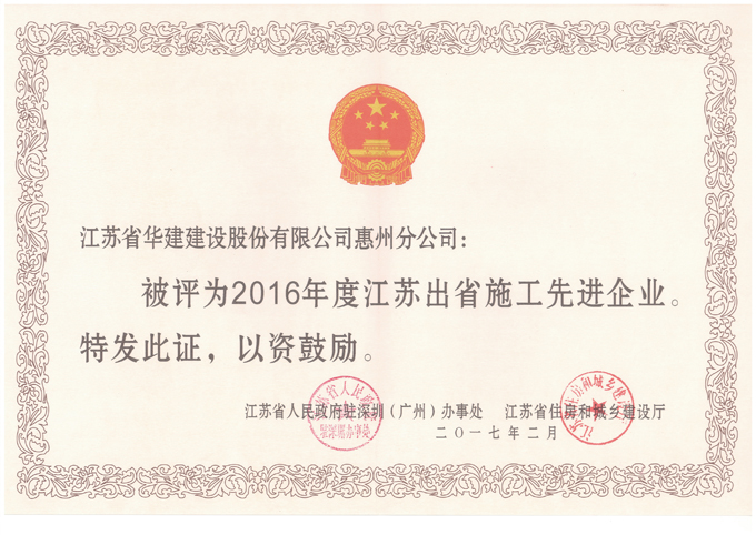 惠州公司榮獲“2016年度江蘇出省施工先進企業”稱號 時間:2017-03-28 2703 3月24日,江蘇省人民政府駐深圳(廣州)辦事處和江蘇省住房和城鄉建設廳在海口召開2017年江蘇建筑業南方區工作會議,表彰了一批施工先進企業、優秀企業經理、優秀建造師和先進個人。惠州公司獲評“2016年度江蘇出省施工先進企業”,總經理周群利被評為優秀企業經理,黃秀剛被表彰為質量安全先進個人,邵群斌被表彰為經營財務先進個人,劉磊被表彰為新聞報道先進個人。
