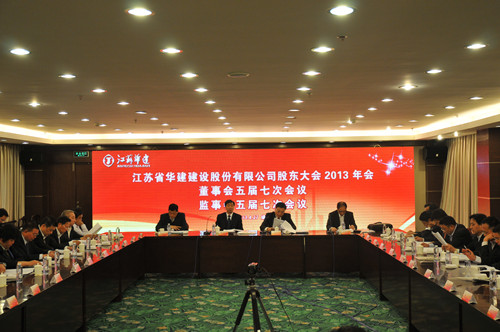 4月27日下午,江蘇省華建建設(shè)股份有限公司股東大會2013年會暨董事會、監(jiān)事會五屆七次會議在揚州召開。會議由陸金龍董事長主持,10名股東代表、11名董事、4名監(jiān)事出席會議,公司高級管理人員、各分支機(jī)構(gòu)和總部各部室負(fù)責(zé)人、公司律師團(tuán)代表列席會議。會議聽取和審議通過了副董事長、總經(jīng)理宗有農(nóng)同志所作的董事會和經(jīng)營層工作報告,監(jiān)事會主席吳士茂所作的監(jiān)事會工作報告,公司總會計師李長棟同志所作的《關(guān)于2012年度財務(wù)決算和2013年度財務(wù)預(yù)算方案的報告》和《關(guān)于2012年度股利分配方案的報告》。