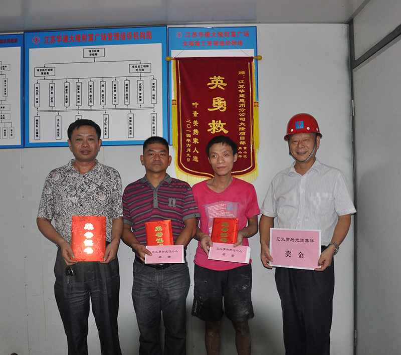 會上,惠州公司副總經理、總工程師龐文榮、分工會主席王健代表分公司經理室和工會向肖小平、黃小江兩位同志發放“見義勇為先進個人”證書,向大隆財富廣場項目部發放“見義勇為先進集體”證書,并給予一定數額的現金獎勵。同時號召大家向兩位同志學習,學習他們舍己救人的崇高精神,學習他們樂于助人的高尚品德,為樹立公司良好精神面貌、傳遞社會正能量做出新的貢獻。