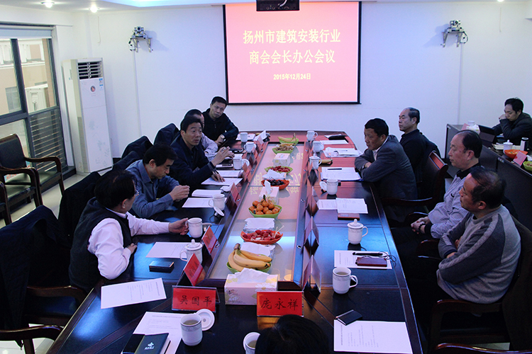 1224日下午,揚州市建筑安裝行業商會在江蘇滬武建設集團會議室召開2015年度會長辦公會,陸金龍會長主持會議,各位副會長、秘書長參加會議,揚州市委統戰部副部長、市工商聯副主席兼黨組書記、市總商會副會長趙振東和市工商聯(總商會)會員處處長田德兵應邀出席。