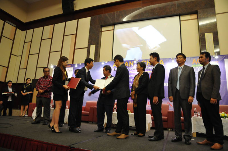 本次大會由中國東盟中心參與主辦,特邀我市海促會和APEC協會參加,來自中國和東盟有關國家的近500名代表參會。陸金龍會長作為大會邀請的VIP嘉賓在前排就座,并作為7名業務交流代表之一在大會上發言。他著重介紹了海促會的性質、宗旨和成立以來在海外市場拓展方面的工作成效,以及參會主要企業特別是江蘇華建的基本情況。他強調說,當下是聯盟抱團、合作雙贏的時代,揚州海促會和APEC協會所屬成員單位希望與國際國內理念同頻的優秀企業,深化在投資、開發、施工等領域的戰略合作,推動優勢資源互補,強強聯合,互生共贏。陸會長還代表海促會與馬來西亞砂拉越企業家協會簽署了合作諒解備忘錄。在參展展位現場,來自馬來西亞、泰國、柬埔寨等東盟國家的政府和企業界許多代表,都對揚州企業代表團的實力感興趣,紛紛駐足停留、索取資料、洽商合作意向,不到半天,各個企業所帶資料就被索要一空,會議間隙、用餐時都有主動過來洽商合作的會議代表。