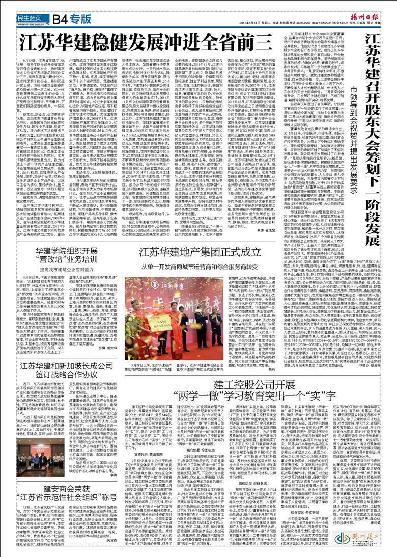 今日《揚州日報》刊登專版文章報道華建進入全省前三有關消息 時間:2016-06-14 4214 今天出版的《揚州日報》B4“揚州建工”專版刊登了江蘇華建穩健發展沖進全省前三、華建股東大會、華建地產集團成立、“兩學一做”學習教育等相關文章,歡迎關注。