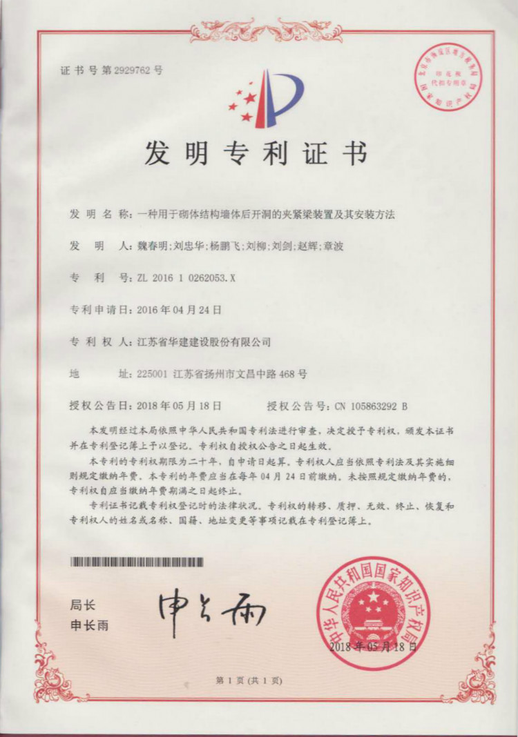 上海分公司發(fā)布的《一種用于砌體結(jié)構(gòu)墻體后開洞的夾緊梁裝置及其施工方法》(專利號:ZL201610262053.X)獲得發(fā)明專利授權(quán)。