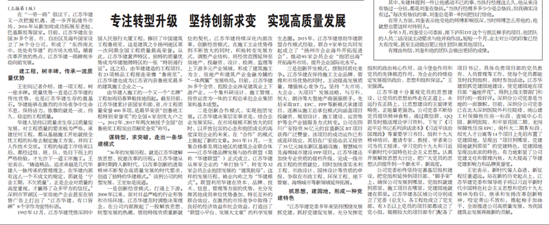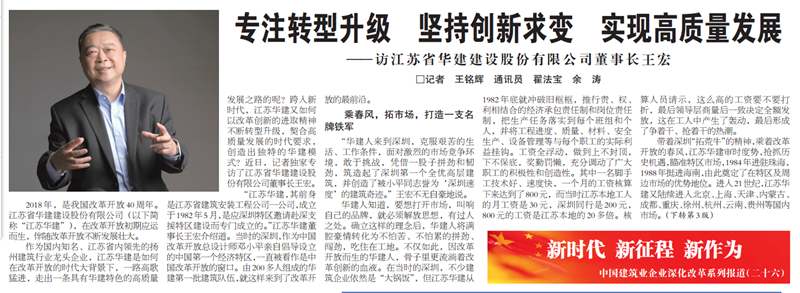 王宏董事長接受《建筑時報》專訪:專注轉型升級,堅持創新求變,實現高質量發展 時間:2018-09-11 4091 9月10日,《建筑時報》頭版及微信公眾號對王宏董事長的專訪給予了刊載。 王宏董事長在專訪中就江蘇華建成立36年來,是如何在改革開放的時代大背景下,走出一條具有華建特色的高質量發展之路,跨入新時代,江蘇華建又是如何以改革創新的進取精神不斷轉型升級,契合高質量發展的時代要求,創造出獨特的華建模式進行了詳細介紹。