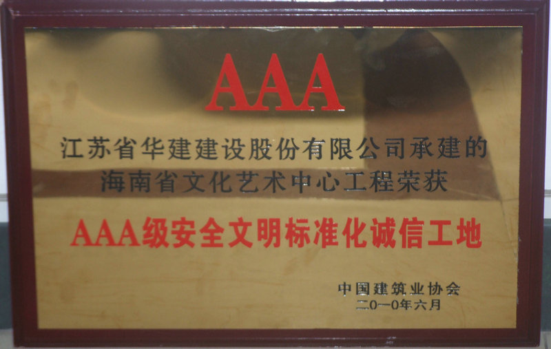 “海南省文化藝術中心”項目榮膺全國AAA級安全文明標準化誠信工地 時間:2010-07-24 5197 近日,經中國建筑業協會建筑安全分會在專家評審、組織抽查和網上公示,海南公司承建的海南省文化藝術中心工程榮膺全國“AAA級安全文明標準化誠信工地”,這是海南公司近年來首次獲得此項榮譽。 該項目自開工以來,以摘取魯班獎為最高質量目標,積極策劃,精心組織,以過程創精品,狠抓細部施工,各項指標始終處于受控狀態,多次接受省、市領導、專家、同行的現場觀摩,獲得業內高度評價。
