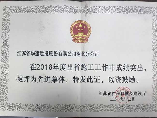 湖北分公司獲評2018年度江蘇出省施工先進(jìn)集體