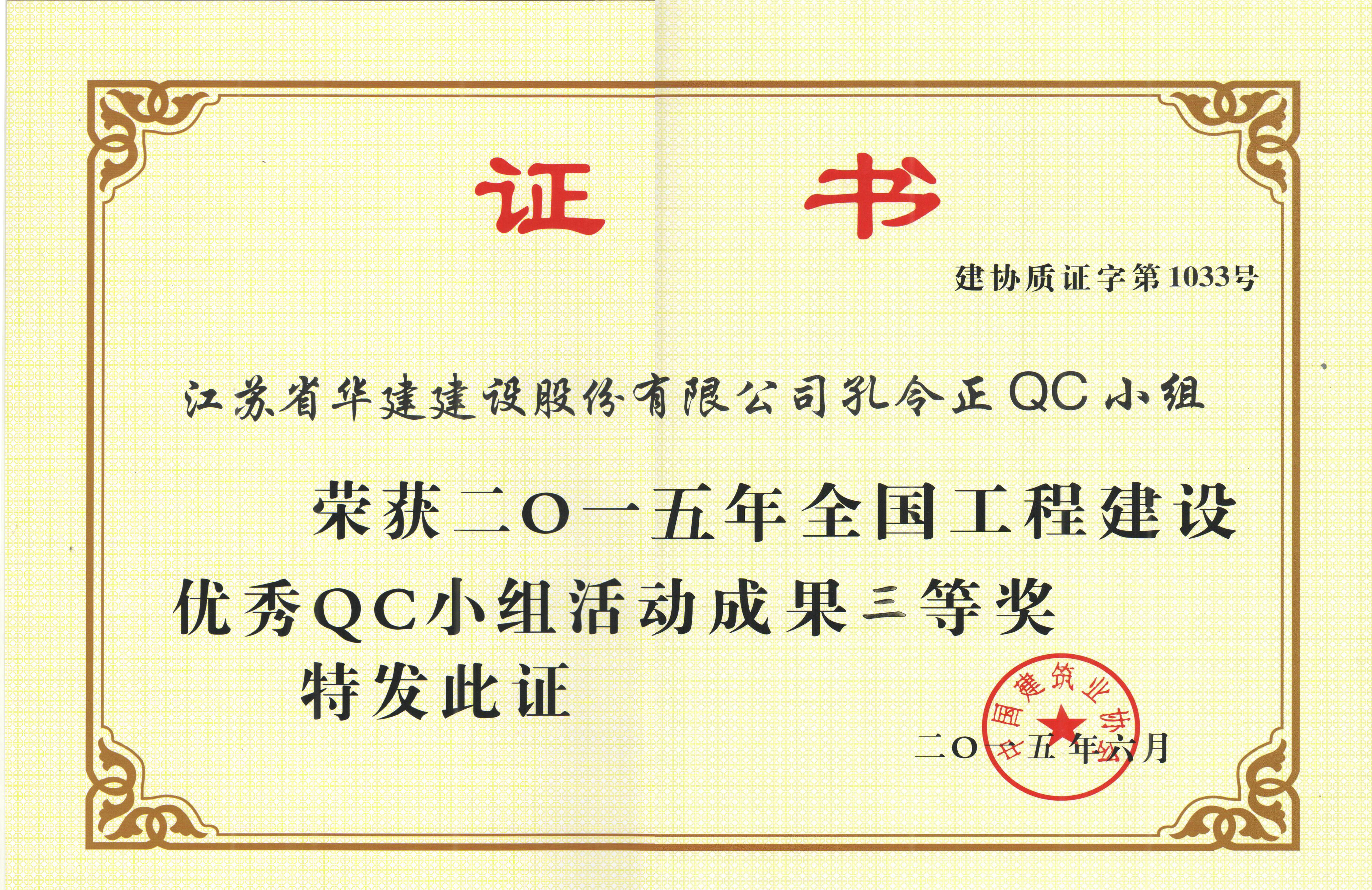 6月23—25日,由中國建筑業(yè)協會舉辦的“2015年全國工程建設優(yōu)秀QC小組活動成果交流會”在云南昆明舉行。珠海區(qū)域公司“江蘇省華建建設股份有限公司孔令正QC小組” 經江蘇省建筑行業(yè)協會推薦參加交流會,其成果《剝蝕丘陵地貌多形截面鋼筋混凝土灌注樁施工新方法》榮獲中建協QC成果三等獎。中國建筑業(yè)協會QC成果獎是建筑領域QC成果最高獎項,該獎項的獲得是對公司在技術質量管理工作方面的充分肯定。此外根據該項成果編寫的工法還獲得2014年度江蘇省省級工法。