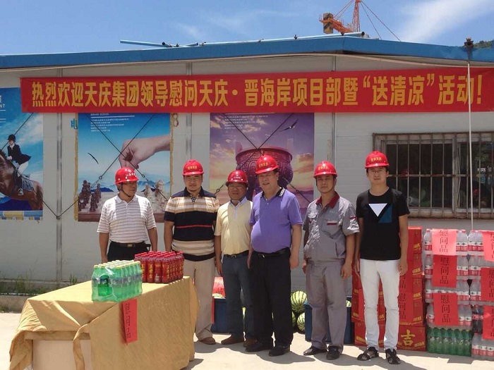 千里送清涼——天慶集團董事長韓慶慰問我司一線職工 時間:2015-08-05 4115 8月4日中午,烈日當空,驕陽似火。甘肅天慶房地產集團有限公司董事長韓慶一行不遠千里來到廣東珠海,頂著烈日,冒著酷暑,在項目負責人陳建的陪同下,慰問我司承建的“天慶·晉海岸”項目一線施工人員,給工人們送來了西瓜、礦泉水、王老吉等飲品和深情問候,讓廣大一線職工在炎炎烈日下感受到陣陣清涼。