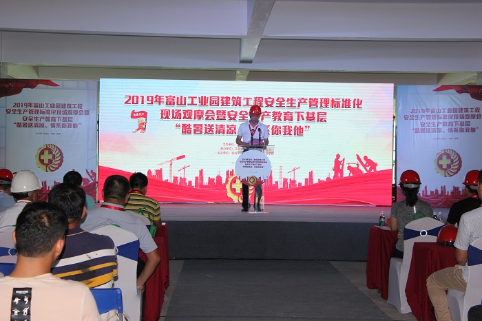 7月8日下午,2019年富山工業園建筑工程安全生產管理標準化現場觀摩會暨安全生產教育下基層“酷暑送清涼、情系你我他”活動在公司承建的通得電氣富山工業園項目現場隆重舉行。富山工業園開發建設局局長霍詠梅,珠海市建筑安全協會秘書長張麗,珠海市建筑安全職業技能培訓學校校長江春華,江蘇華建珠海區域公司總經理呂方達,以及富山工業園區管委會工作人員、建設單位、監理單位、施工單位等200余人參加。