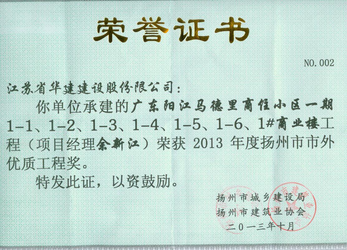 2013年陽(yáng)江陽(yáng)光馬德里項(xiàng)目揚(yáng)州市市外優(yōu)質(zhì)工程獎(jiǎng)