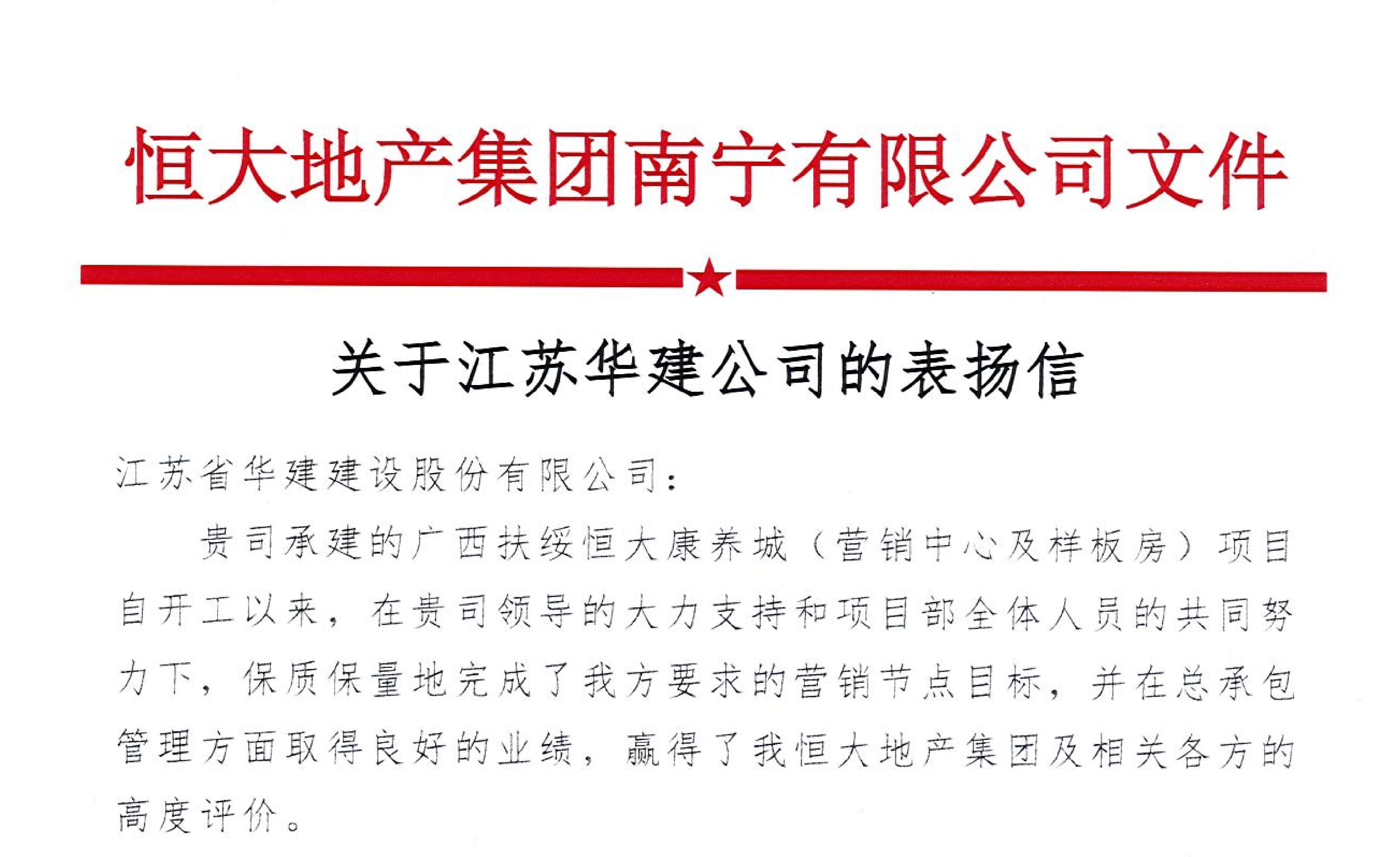 近日,公司收到恒大地產集團南寧公司發來的表揚信,信中對我公司出色完成廣西扶綏恒大康養城營銷...