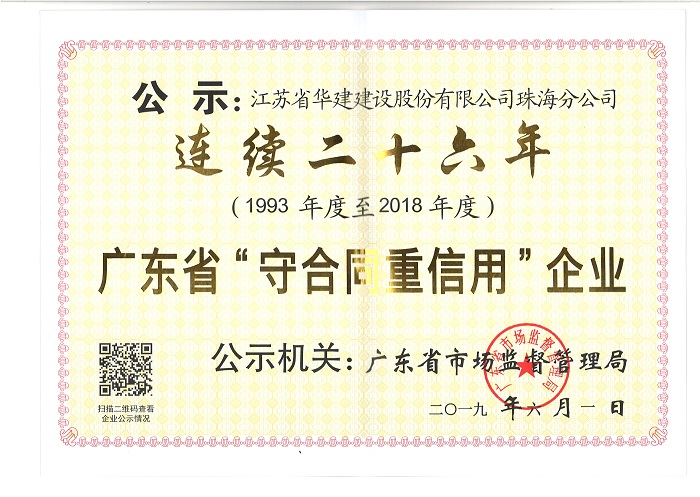 近日,珠海分公司被廣東省市場(chǎng)監(jiān)督管理局(原公示機(jī)關(guān)為廣東省工商行政管理局)授予“連續(xù)二十六...