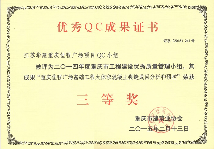 近日,重慶市建筑業(yè)協(xié)會(huì)發(fā)文表彰了一批優(yōu)秀QC成果,公司重慶佳程廣場(chǎng)項(xiàng)目QC小組被評(píng)為201...