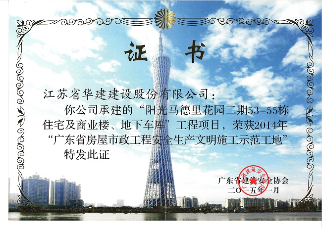 陽光馬德里二期工程榮獲2014年廣東省房屋市政工程安全生產文...