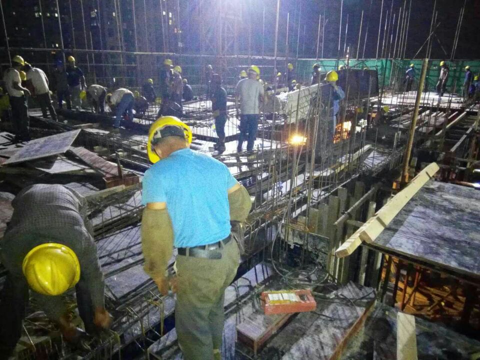 客戶的要求就是使命。江蘇華建上海公司本著“客戶至上”的原則,立即成立臨時指揮部,上海公司蘇南分公司、第八工程處全員出動,在短短的一個小時內(nèi)完成了施工方案制訂、班組人員協(xié)調(diào)和設(shè)備材料到位等全部準備工作。配置鋼筋工46人、木工78人、瓦工18人、水電工23人。30日上午9點,開始墻柱鋼筋綁扎作業(yè),并在3小時內(nèi)完成任務(wù),期間同時穿插木工搭設(shè)排架、安裝墻板等施工作業(yè)。下午2模板頂板鋪設(shè)基本完成,水電工2小時內(nèi)完成水電預(yù)埋。下午6木工用時2小時完成吊模作業(yè);實測實量組和項目部所有質(zhì)檢員全程跟蹤檢查驗收,嚴把工程質(zhì)量關(guān)夜間10完成問題整改使之具備砼澆筑條件31日凌晨4七層主體工程砼澆筑工作全部完成,也由此創(chuàng)造出江蘇華建上海公司24小時澆筑一層樓的施工新速度。